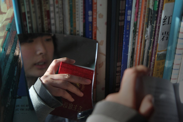 2012年11月27日,一名老师拿来毛主席语录的红册子发给学生们读。