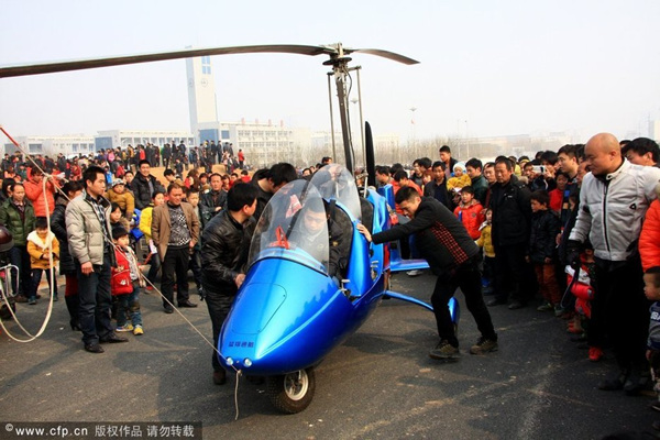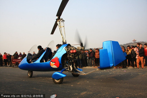 河南小伙开自造价值近百万飞机赴庙会(1)(2)