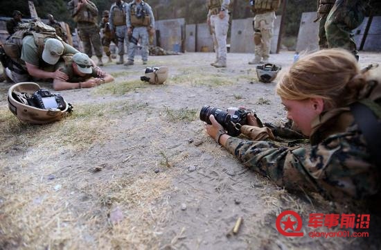 当地时间2011年8月12日,指挥部的Erica在训练中拍摄士兵们演示如何搜寻逃犯